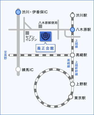 3.八木原駅西方250m、八木原郵便局斜め前のレンガ色の3階建てビルが養正会本部です。